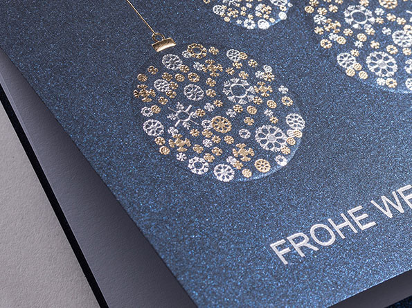 Weihnachtskarten für Firmen, in Blau mit Silberfolienprägung